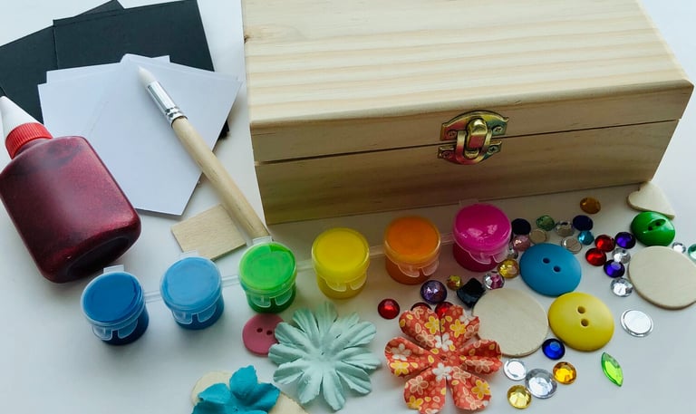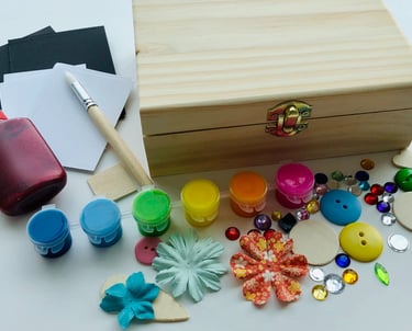 Another popular theme - Treasure Boxes! The celebration starts with decorating celebration bags and sensory bin exploration. Each participant will paint and personalize a wooden treasure box, create unique collages, and enjoy playing with the play dough station. It's the perfect party for fostering creativity and making unique art to take home. Come to us or we can bring this theme to you.